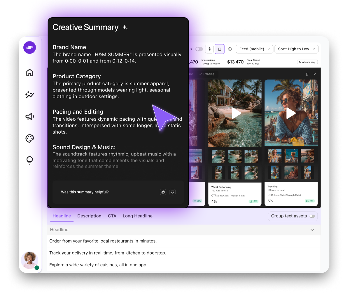 AI Summaries transform complex data into plain-language insights. Spot creative winners, fix underperformers, and act fast with guidance every team can use. No manual analysis required.