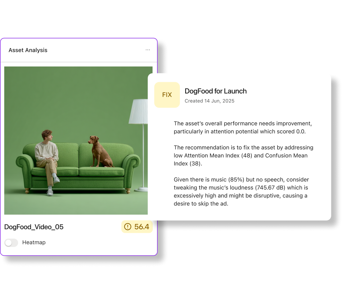 Attention Heatmaps visualize where your audience focuses and when you lose them. Adjust visuals, messaging, and pacing to maximize engagement and hold attention longer, all before launch.